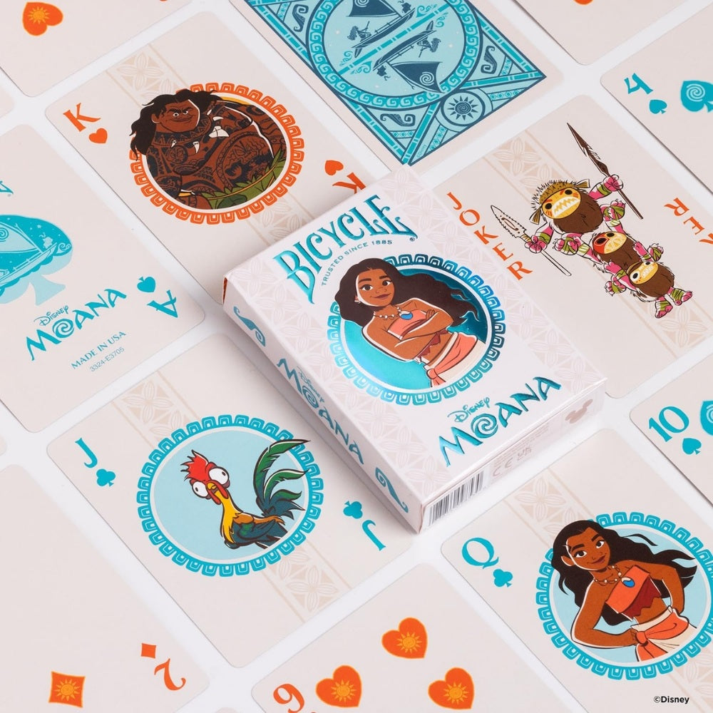 The deck also features custom card backs showcasing Moana’s iconic canoe sailing across ocean blues, creating a visually stunning look that collectors and players alike will appreciate. Whether you're hosting a family game night, playing poker with friends, or practicing your favorite card flourishes and tricks, this deck combines Bicycle’s trusted performance with Disney magic.