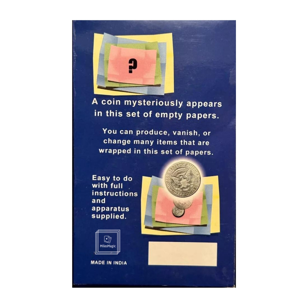 This is placed on the table covered for a minute by the performer's hand, then reopened with a surprise- the coin placed within the innermost packet is found to have changed to a currency note!