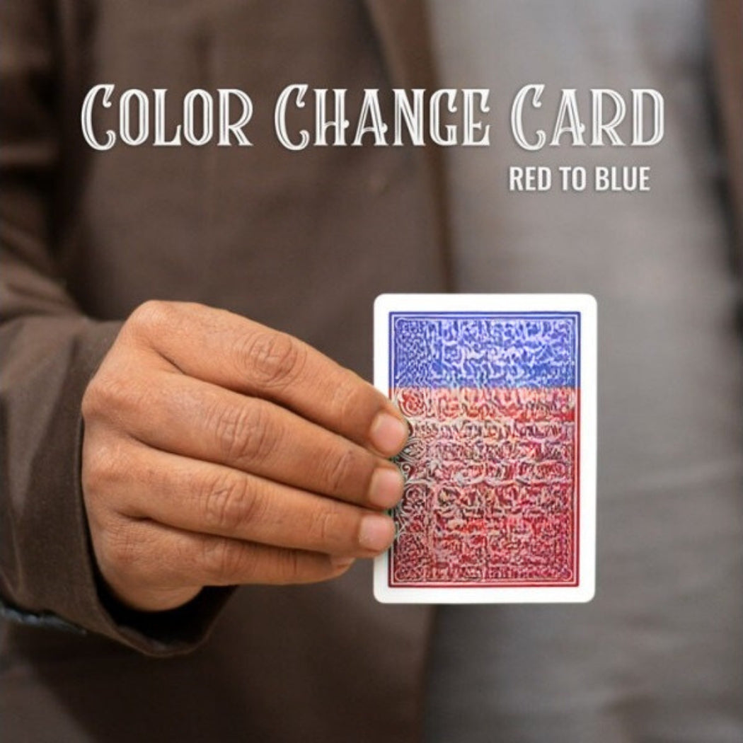 In effect, the magician shows a red color card from the front and back, now he holds the red back in front and just moves his other hand over the card amazingly, 1/3rd portion of red back changes to blue.