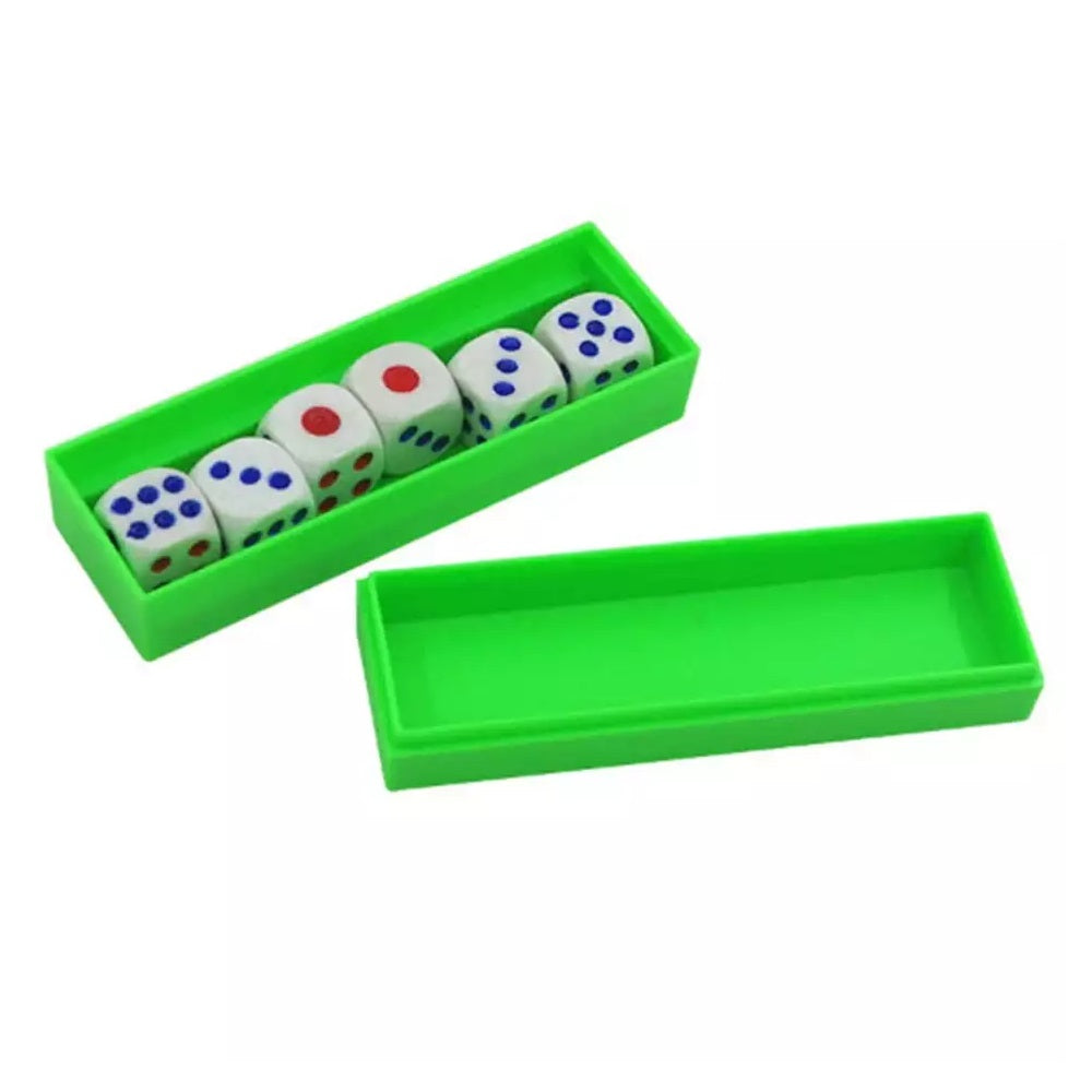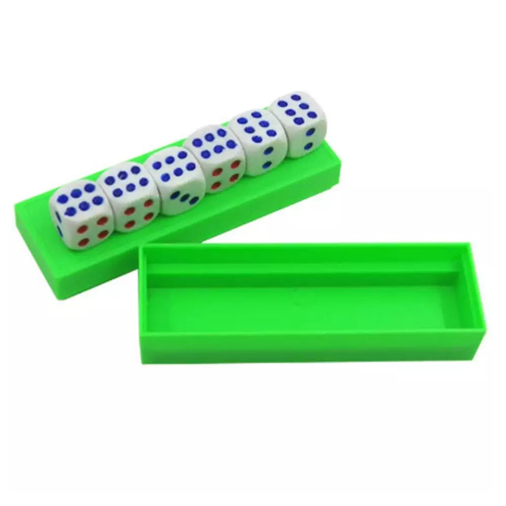 The Magician shows 6 dice in a box and he names 6 different numbers that are not the order of the dice in the box after a quick shake of the box the dice all match the magicians predicted numbers.
