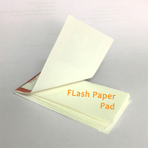 Flash Pads – This is Magicians Flash Paper. Produce flames from your finger tips. The pads ignite into a brilliant flame when touched by a lighter or match. Can be used for dozens of magic effects where the performer requires the extra touch of producing or vanishing items in a bright blaze. Write words on them and once ignited they disappear in a powerful display of fire. 20 Sheets per package.