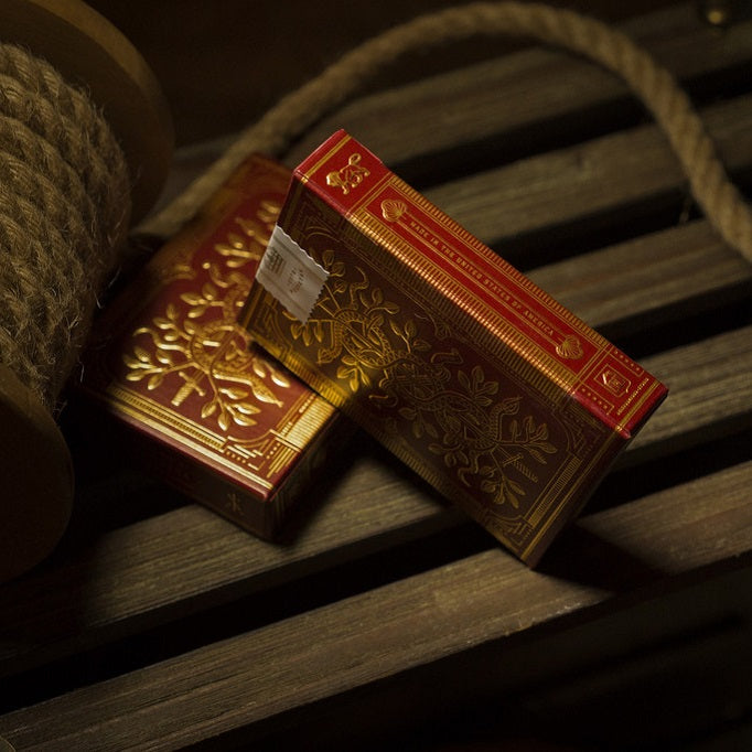 Playing cards fit for a KING – dressed in red. Gold foil, embossed, featuring a first ever silk-finish tuck case.