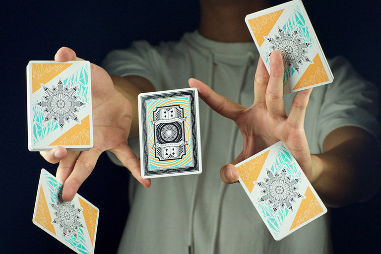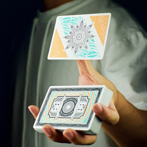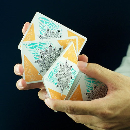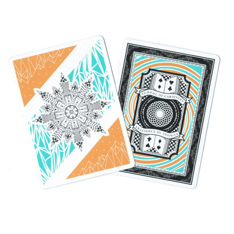 As with the School of Cardistry V1, these cards do not feature standard faces, but instead have a the same design on all 52 cards. Despite being non-standard, the design pays homage to traditional playing cards with elements inspired by court cards on the mandala.