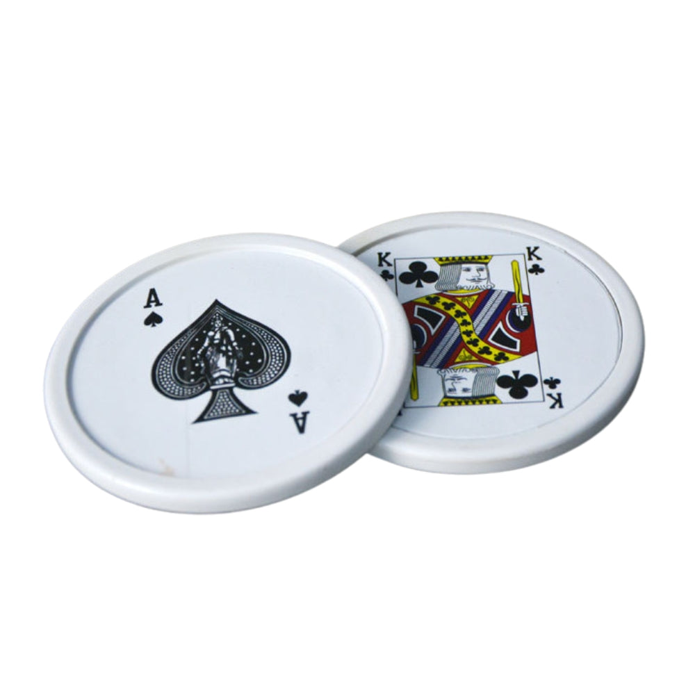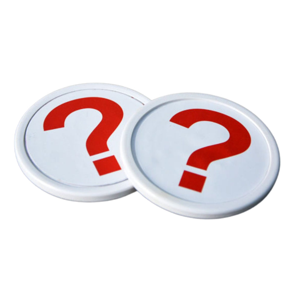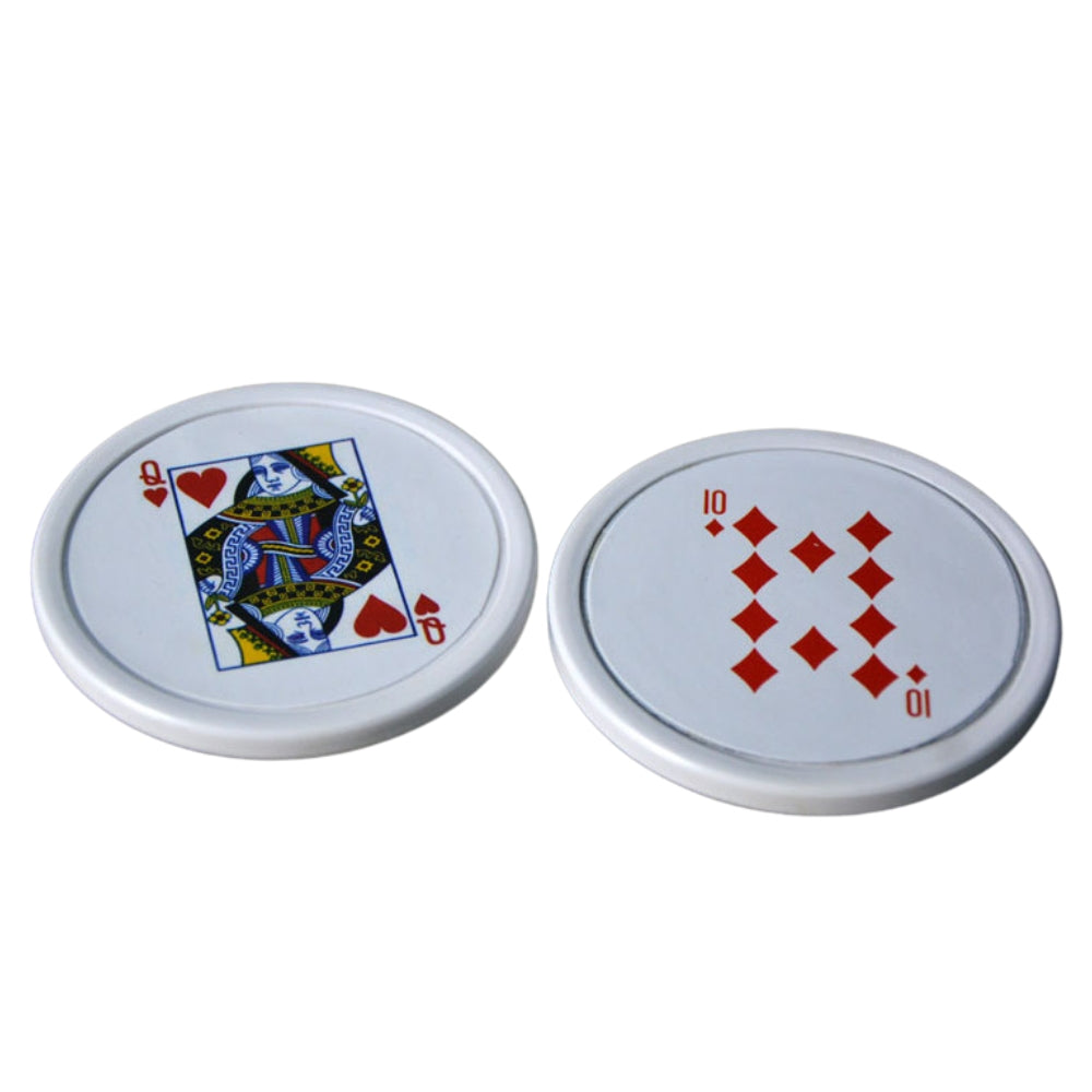 Prepare to leave your audience spellbound with this incredible card prediction trick! A spectator is invited to freely select four cards from any standard deck of playing cards. The magician then introduces two small, round plastic chips, each featuring question marks ("?") on all four sides. The real magic happens when the magician gently rubs the chips together, and the "?" marks instantly and mysteriously transform into images of four different playing cards: Ace of Spades (AS), Queen of Hearts (QH), King of Clubs (KC), and Ten of Diamonds (10D). To everyone's astonishment, these four cards perfectly match the spectator's previously chosen cards, creating an unforgettable magical moment.