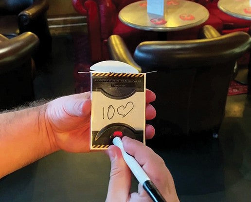 Ask your spectator to write the name of his card on the plastic card in big letters in the middle of the white surface. Let's say he signs the Five of Clubs.