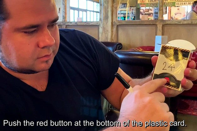 You now take out a small plastic card which the spectator examines. It's a white plastic card with a red button labeled "PUSH." That aside, the card is ordinary.
