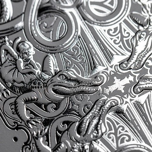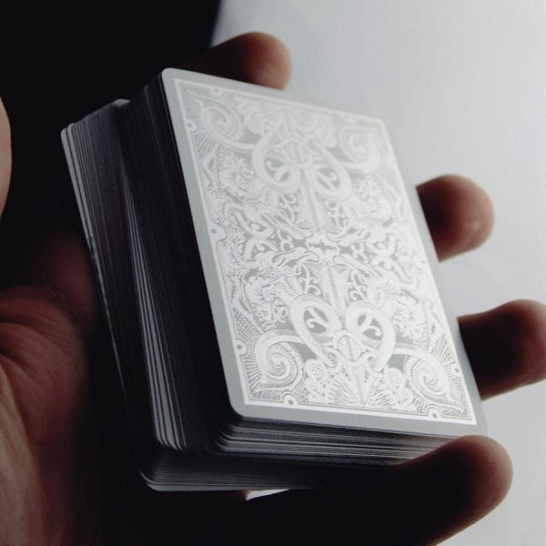 These refined & alluring decks feature Silver Foil & White Foil on White Soft Touch stock. Multi-level sculpted embossing offers intricate textures, while silver foil glints beside icy white foil. Court cards and our new joker design command attention with metallic trim, complimenting card backs designed with reflective silver MetalLuxe ink. The thin crush cards printed on premium stock handle brilliantly and provide subtle artistic features.