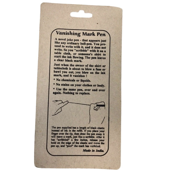 A novel joke pen. You pretend to write with it, and it does not write. So you scribble with it on a table cloth or someone's shirt to start the ink flowing. The pen leaves a clear black mark. Just when the owner of the shirt or tablecloth is about to blow a fuse or bawl you out, you blow on the ink mark, and it vanishes! No special chemicals or liquids.